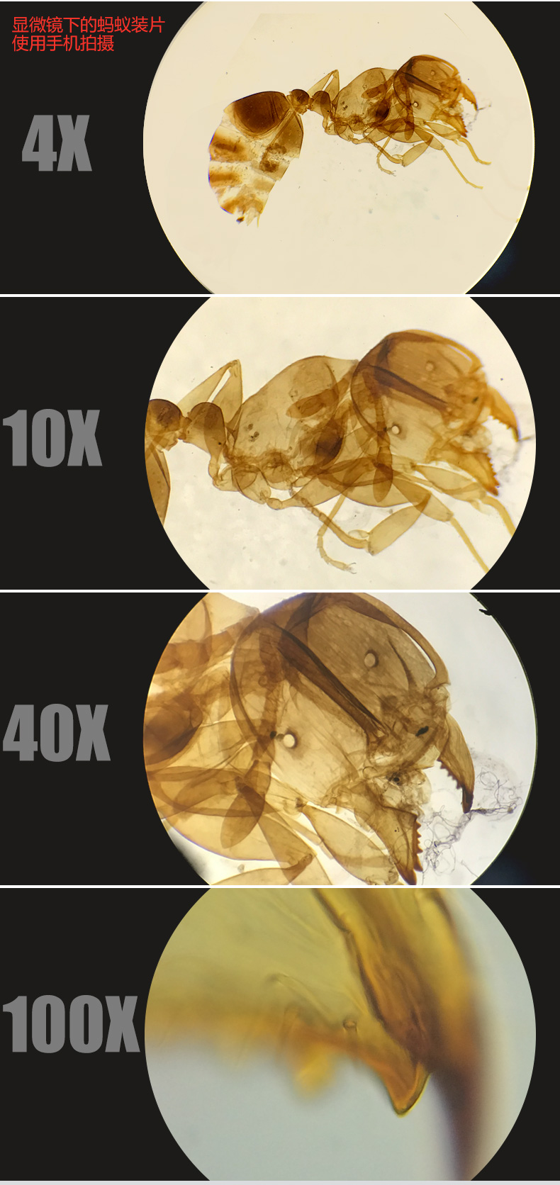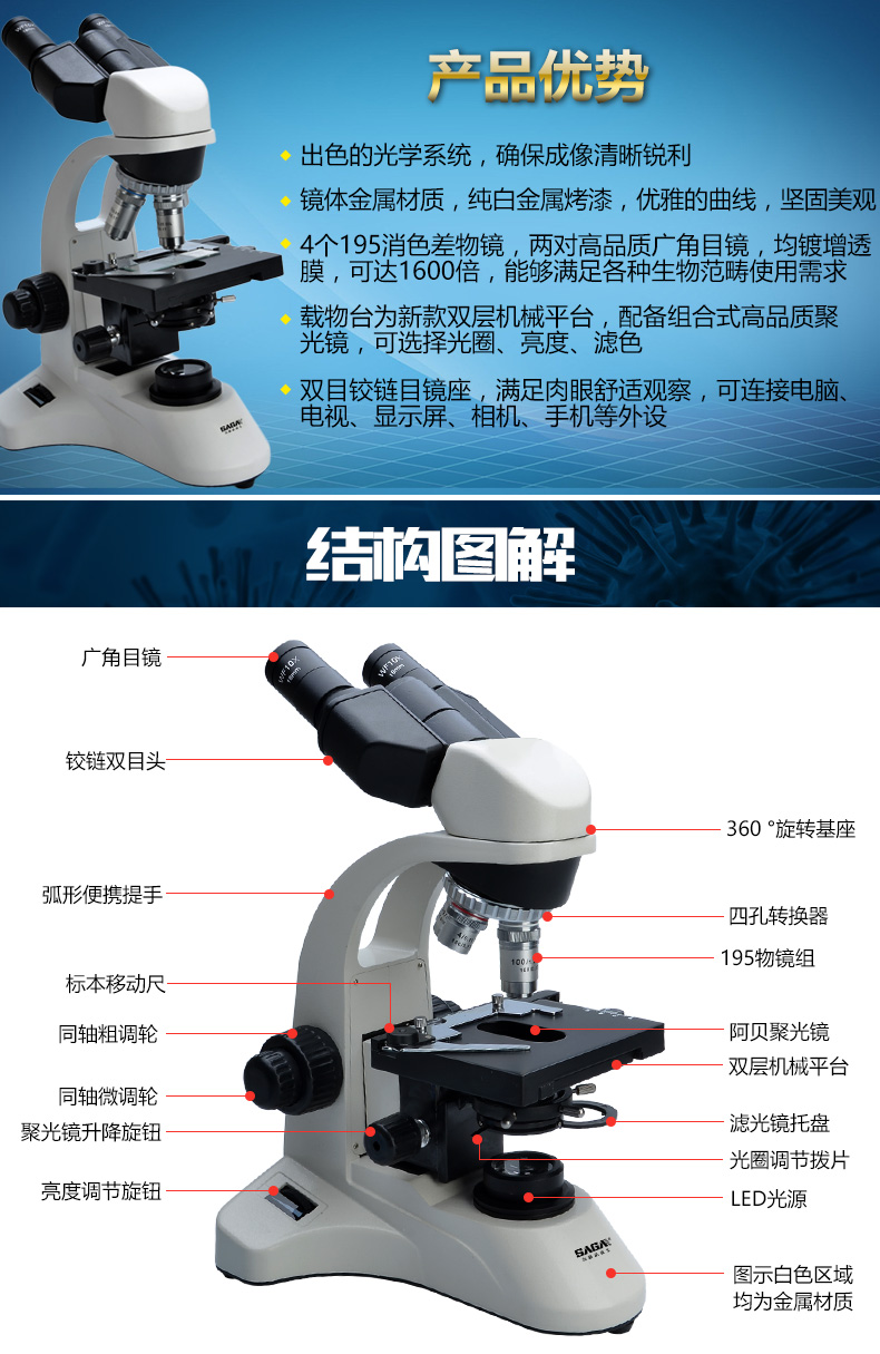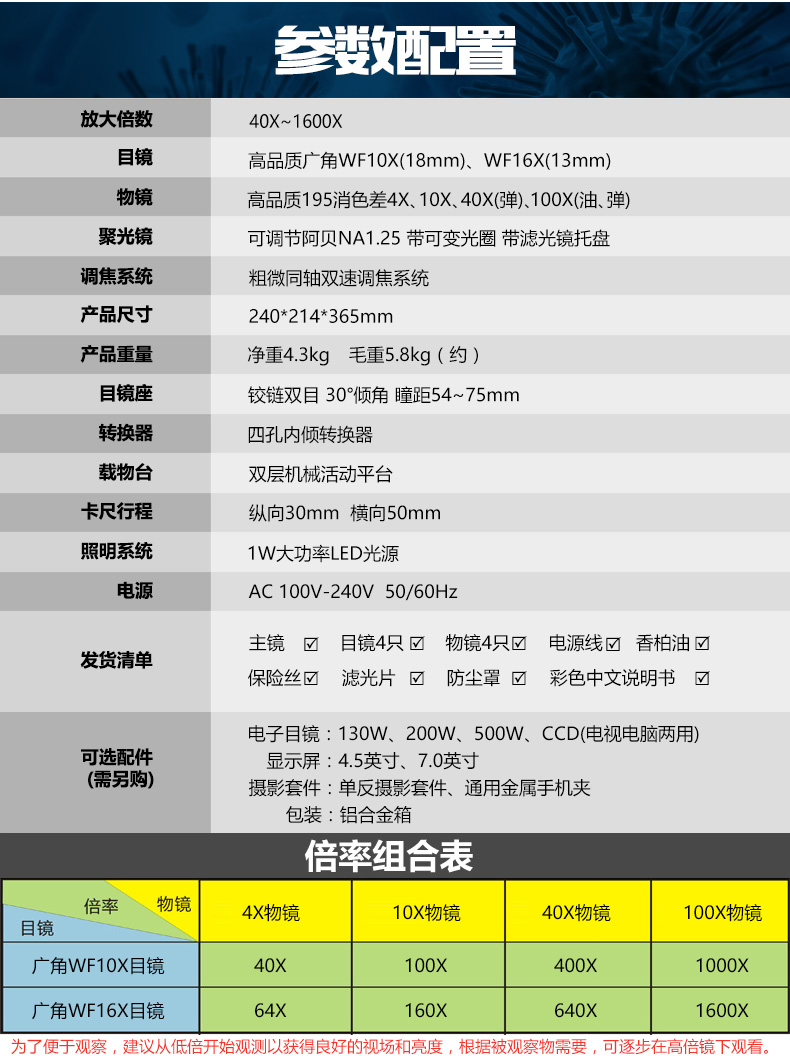 4个195消色差物镜,两只高品质广角目镜,均镀增透膜,可达1600倍,满足各种生物范畴使用需求